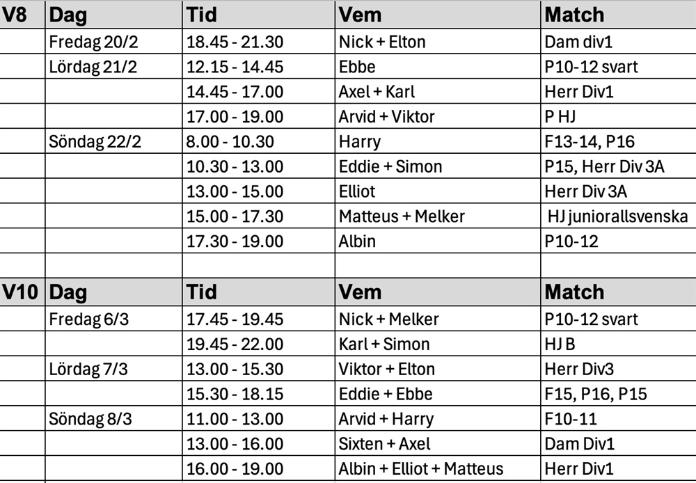 Bekräfta gärna om ni kan ta tilldelad tid. Om ni behöver byta pass, meddela gärna vem ni byter med.