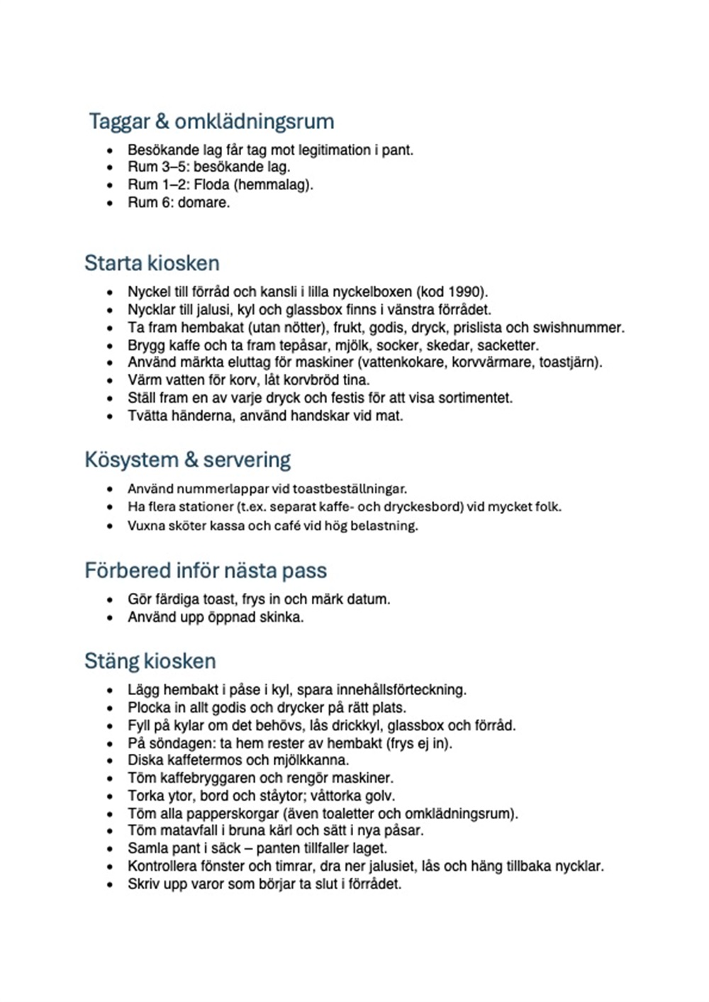 Information om hur man gör i kiosken finns att läsa på flodaibk.se (fliken Café Nova -> dokument) samt på plats i kiosken. Koden till boxen med nyckel till förråden är 1990. Ansvaret att larma av hallen ligger inte på kioskansvarig.